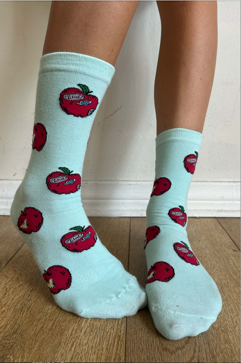 Sweet on your feet 🍎 Teal crew socks topped with a juicy red apple graphic — playful, crisp, and a little cheeky. The perfect pair to wear with mary janes, sneakers, or peeking out of bubble skirts.