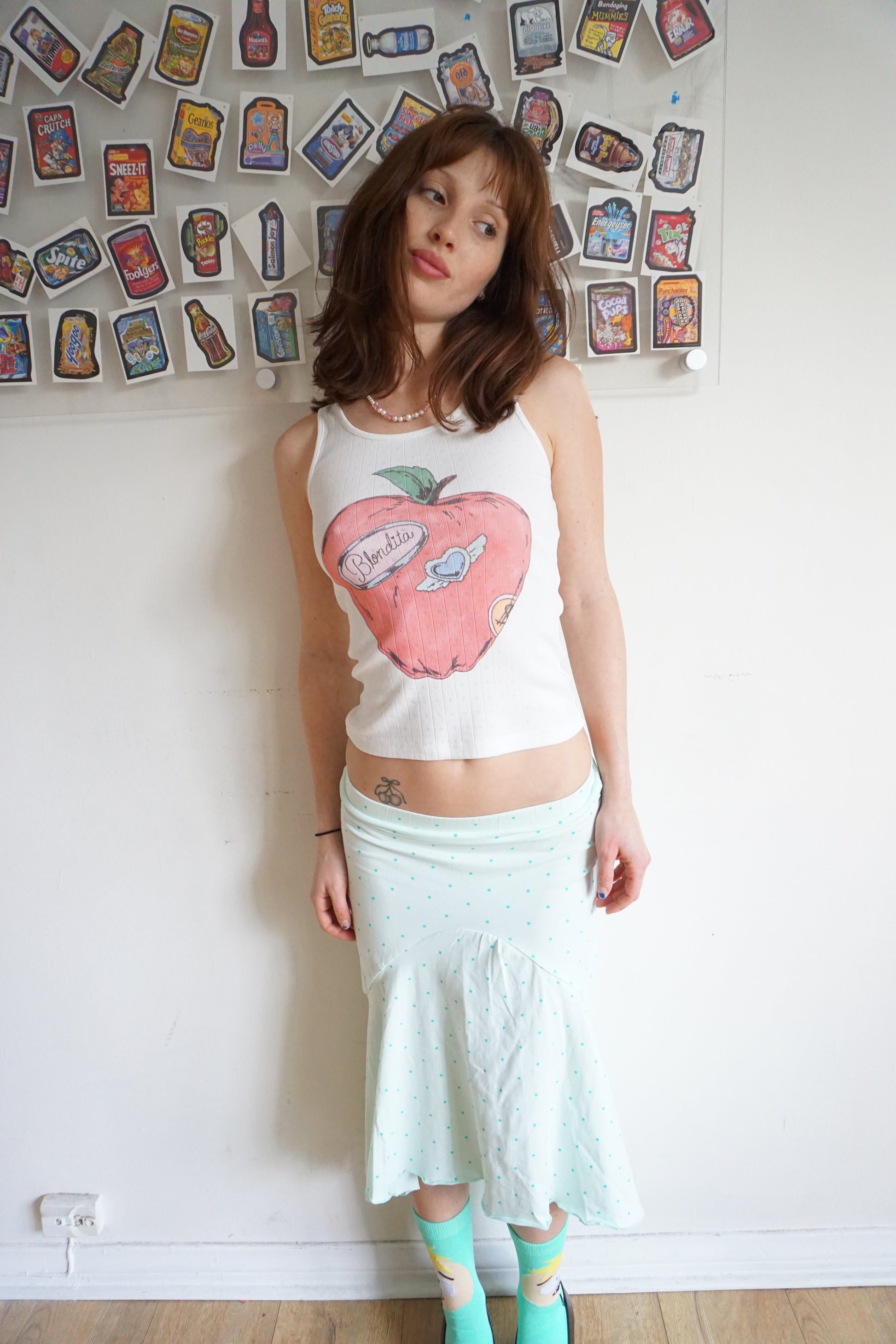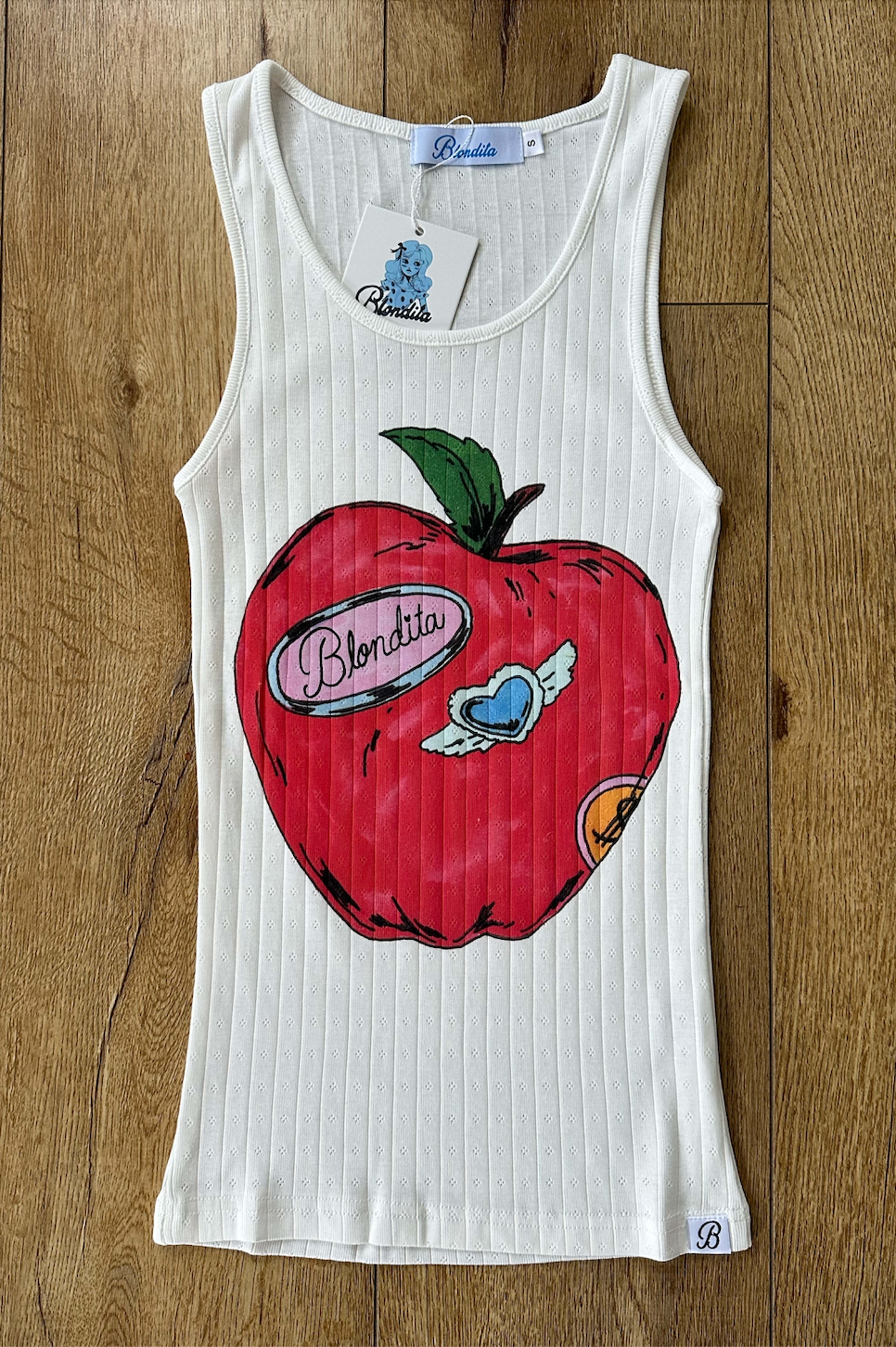 This white pointelle tank features Blondita’s signature apple graphic in a clean, timeless design that feels light, nostalgic, and easy to wear.