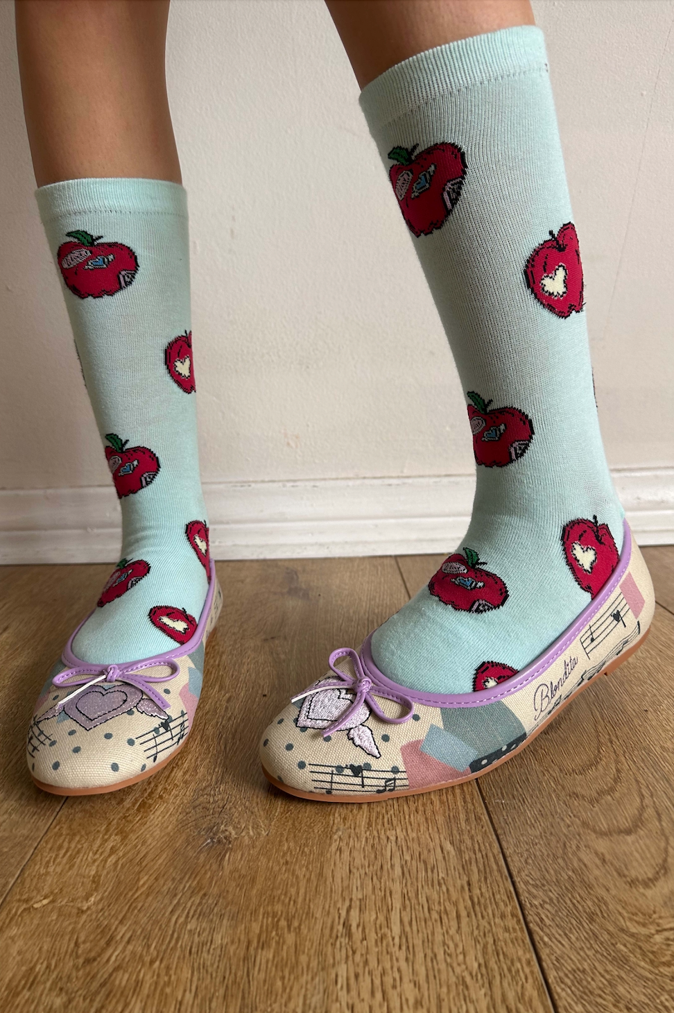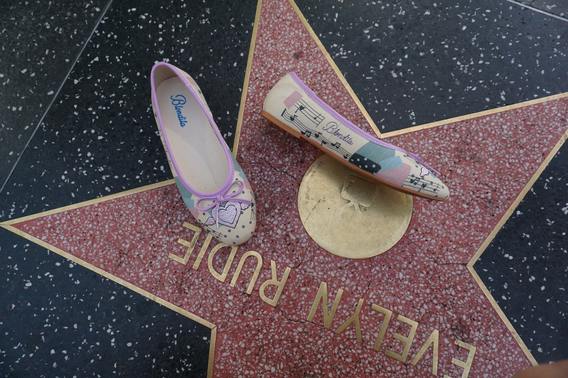 Meet the Blondita Flat🤍 doodles of heart music notes, polka-dots, and pastel fabric patches wrap the canvas flat. She’s accented with light purple trim, topped with a bow and Blondita's heart winged logo embroidered on the top. She's a dreamy, playful statement shoe.