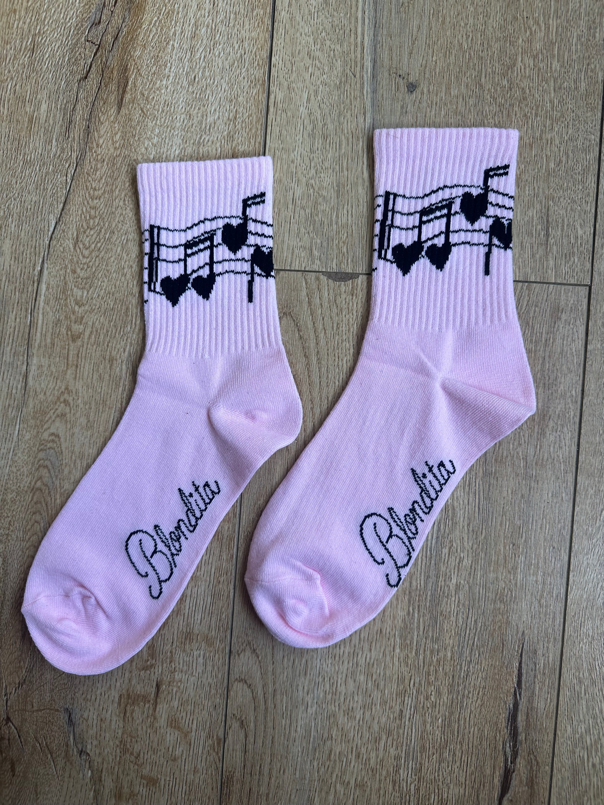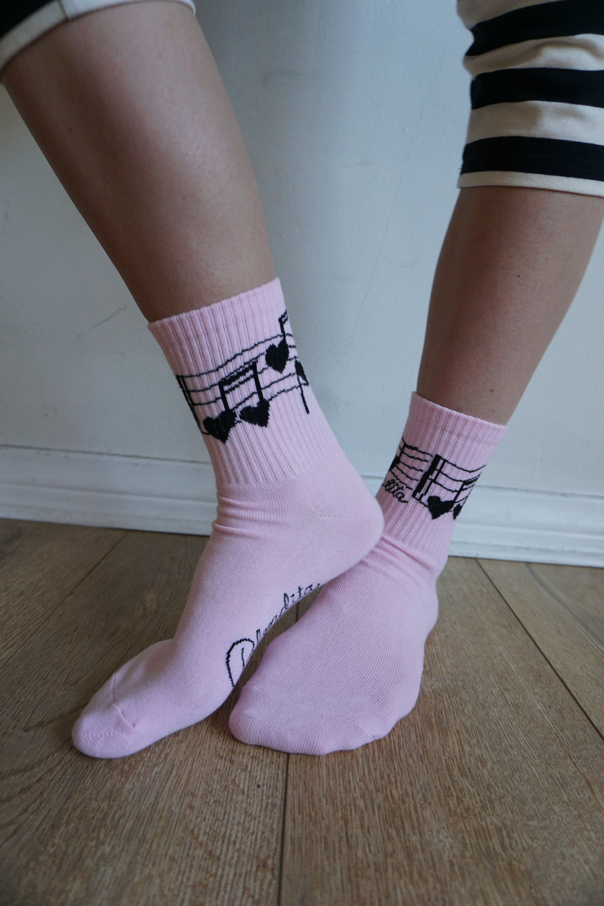 Soft pink crew socks featuring our I Love Music graphic — a small ode to playlists, late nights, and wearing your heart on your sleeves (or ankles).