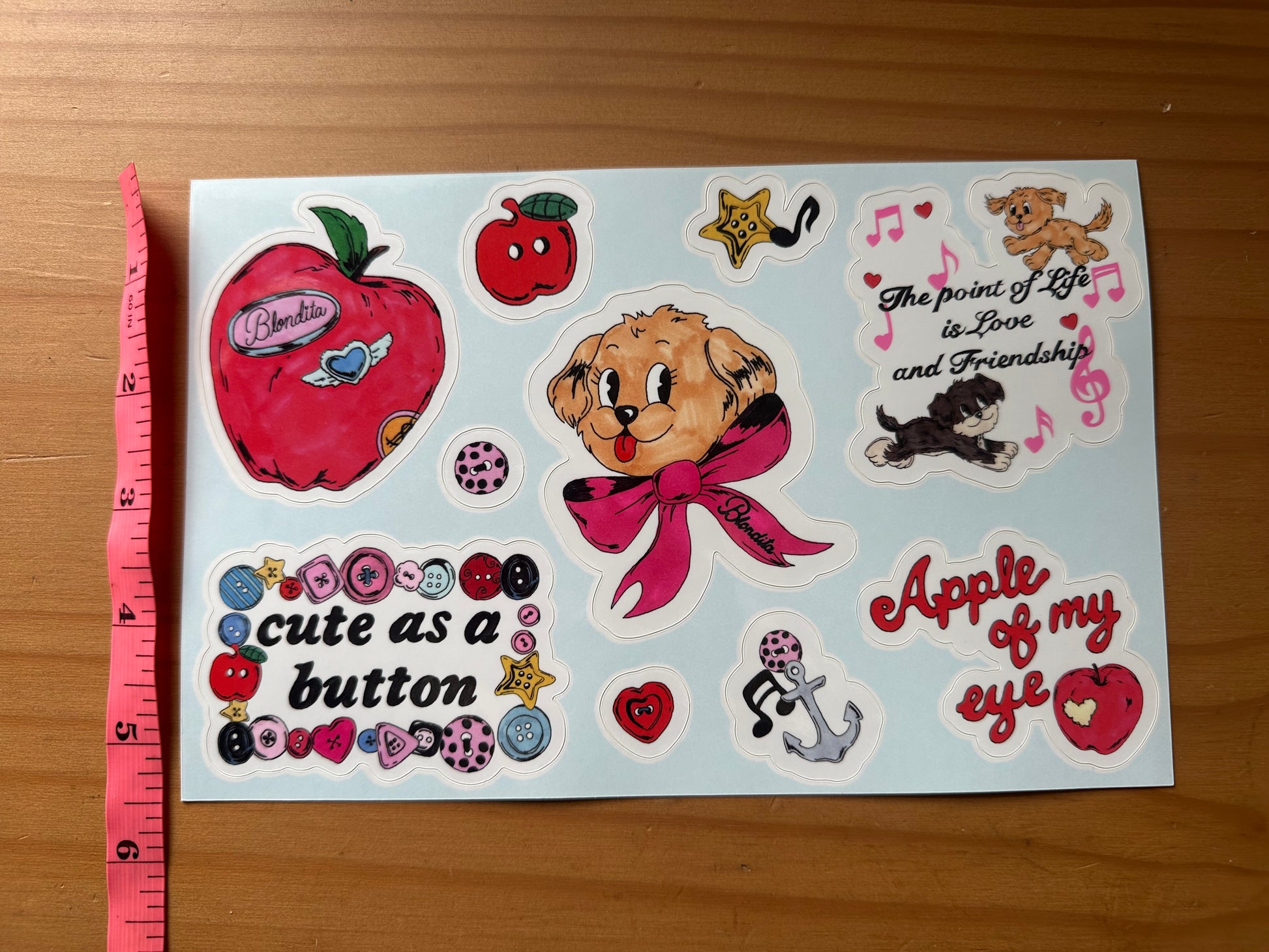 Our first-ever Blondita Sticker Sheet features original hand-drawn artwork, including our signature pup, apple motifs, sailor stars, and button-covered “cute as a button” design. Perfect for decorating your notebooks, phone cases, or packaging your own Blondita orders like a pro 🎶