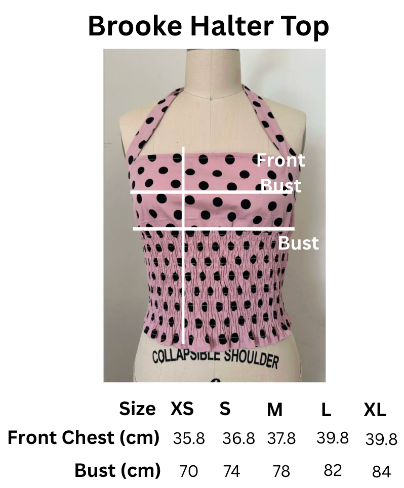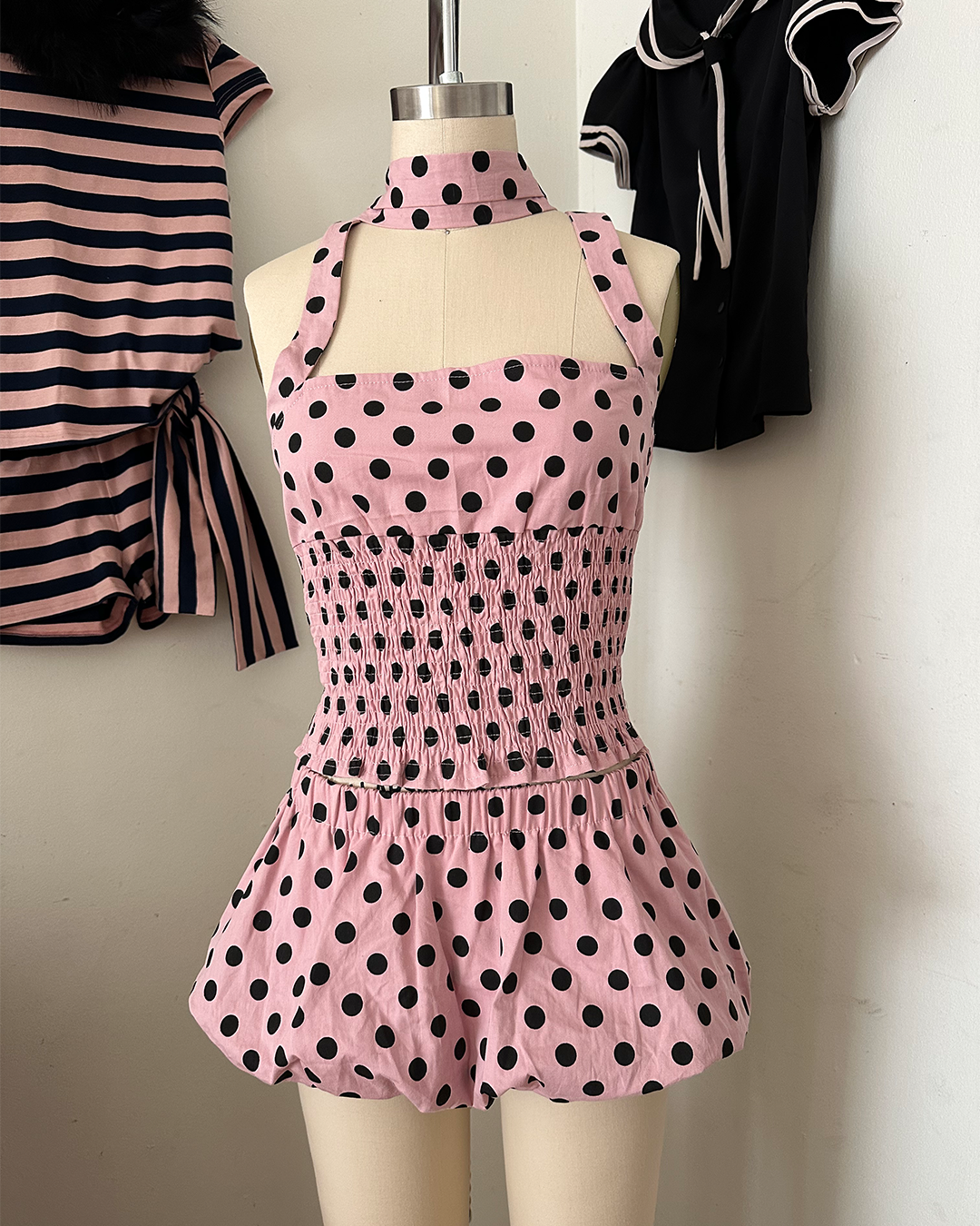 The sweetest pink halter top covered in bold black dots. Designed with a smocked bodice that hugs just right and ties at the neck for that perfect dolly fit. Playful, flattering, and so easy to style — pair it with the matching mini for full Blondita magic.