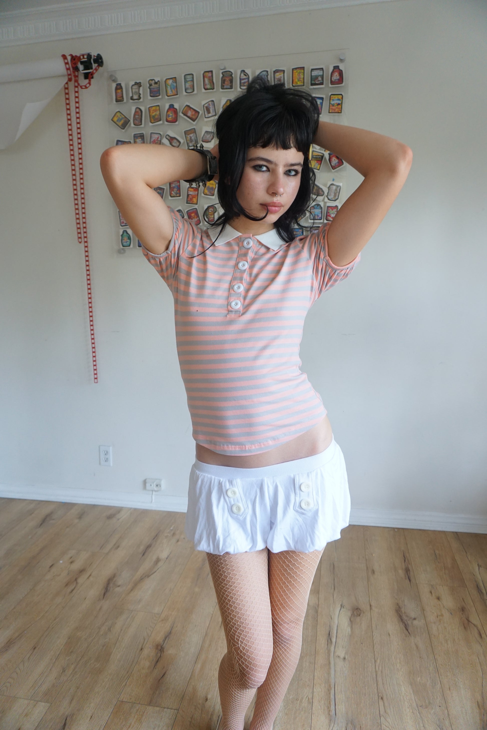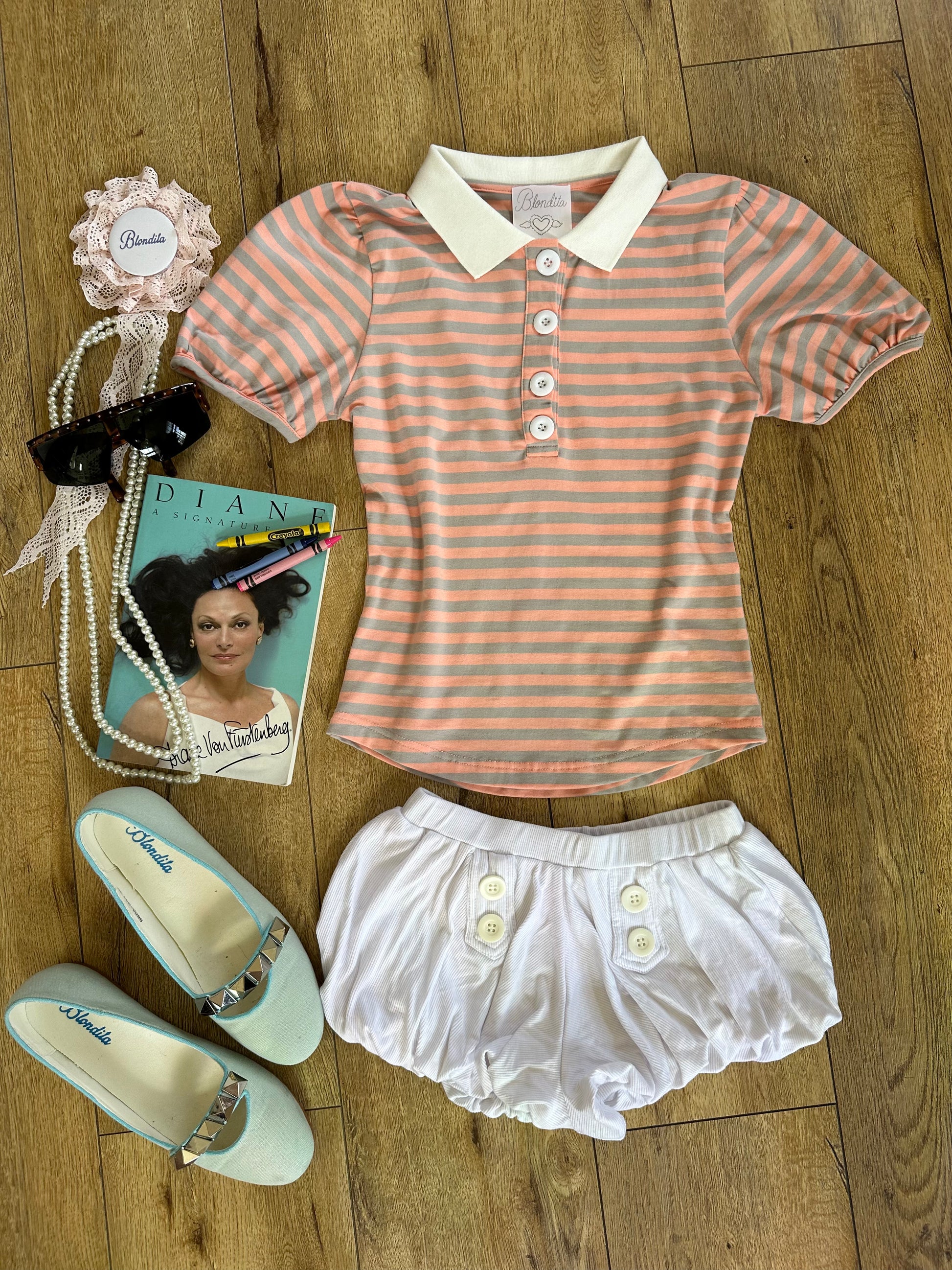 A flirty, form-fitting button-up in coral + gray stripes with puff sleeves + stretch. Named after my cutie pup Ginger :)