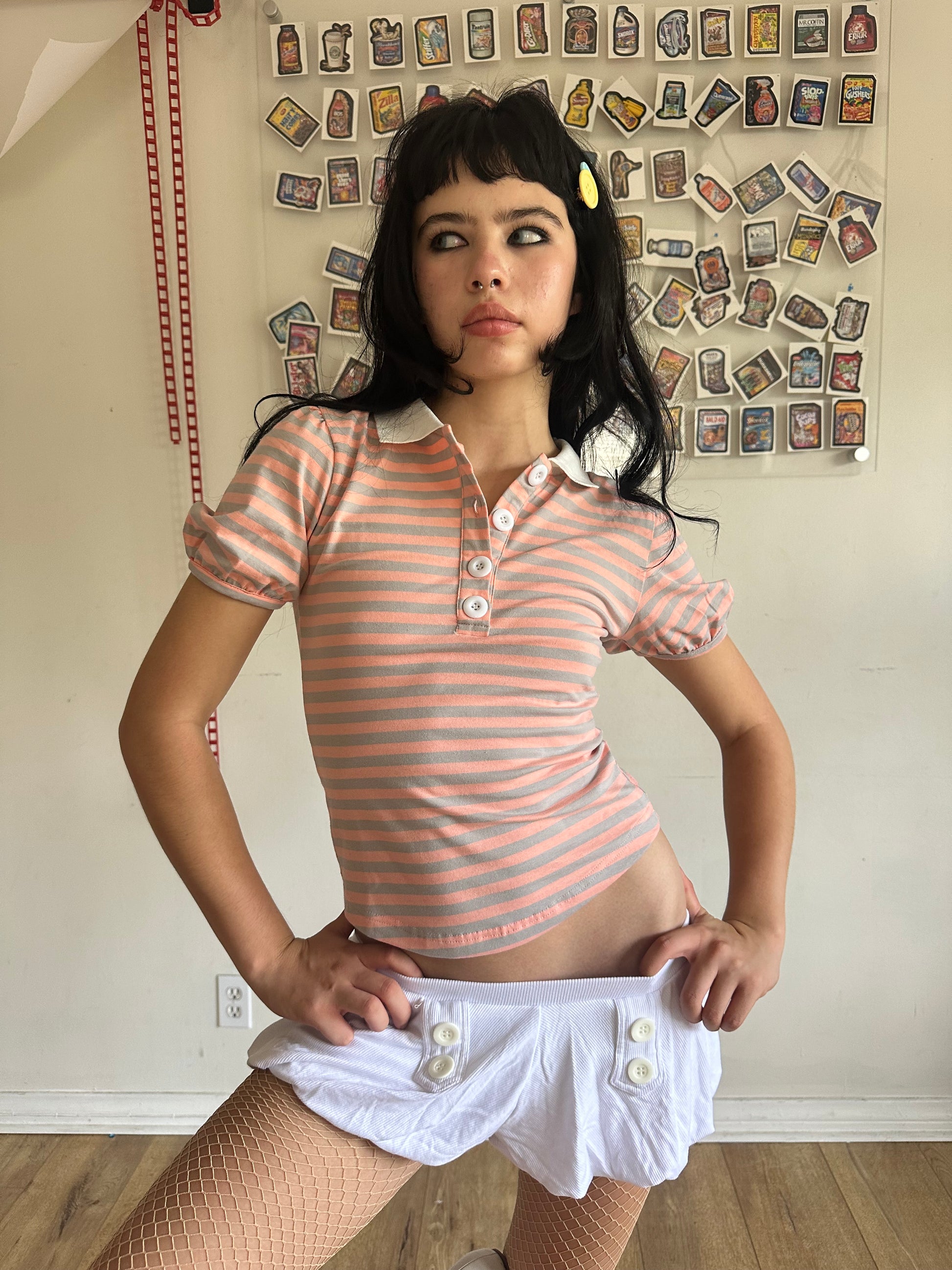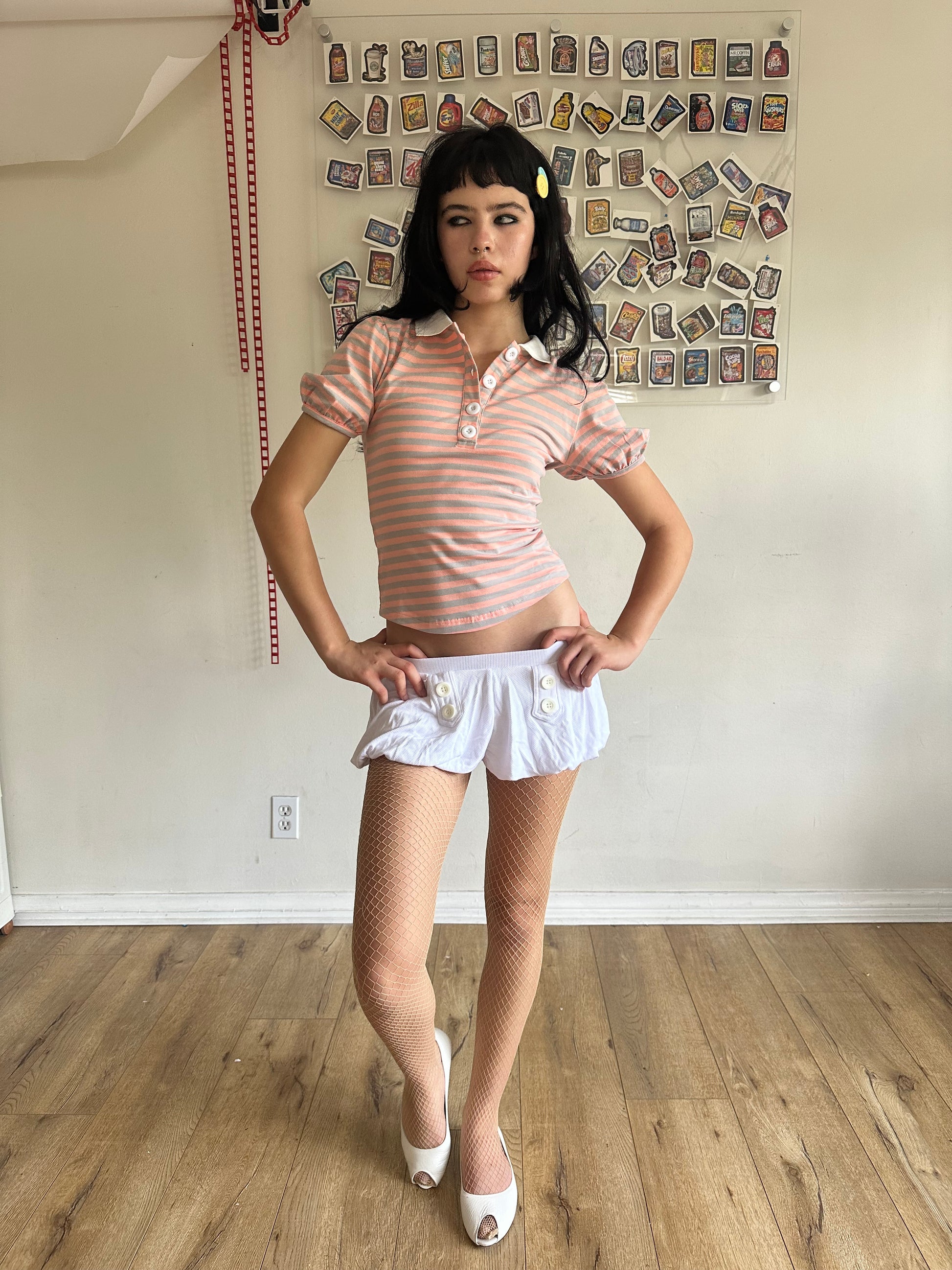 Lotus is seen in a size Extra Small Polo and Extra Small Sailor Bloomers