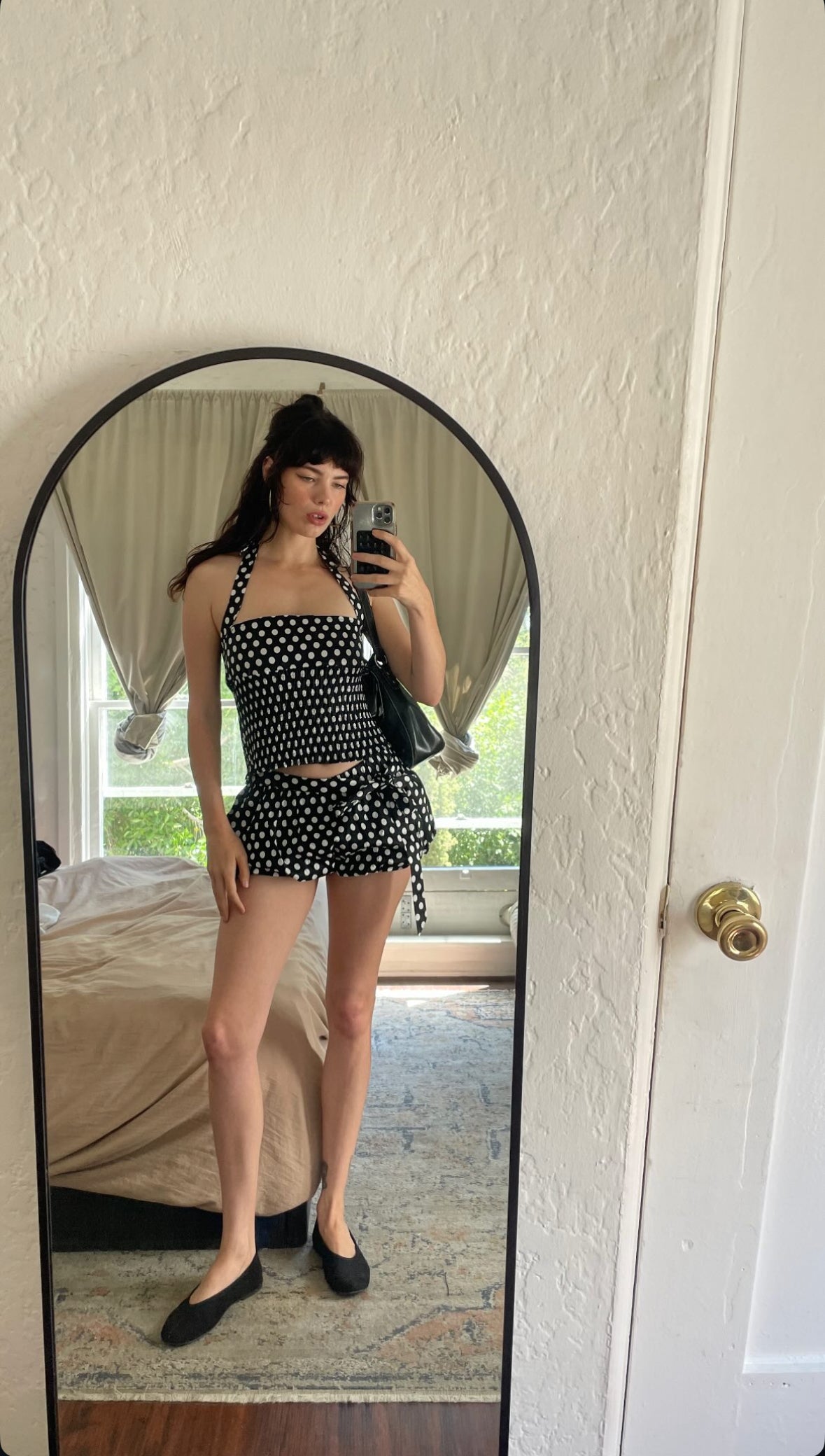 Finished in classic black + white polka dots, she’s playful, dolly, and super easy to style.