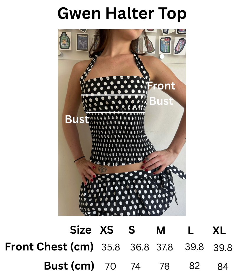 The Gwen Halter is cut in crisp 100% cotton with a smocked bodice that hugs just right and wide halter ties for a retro-flirty fit.