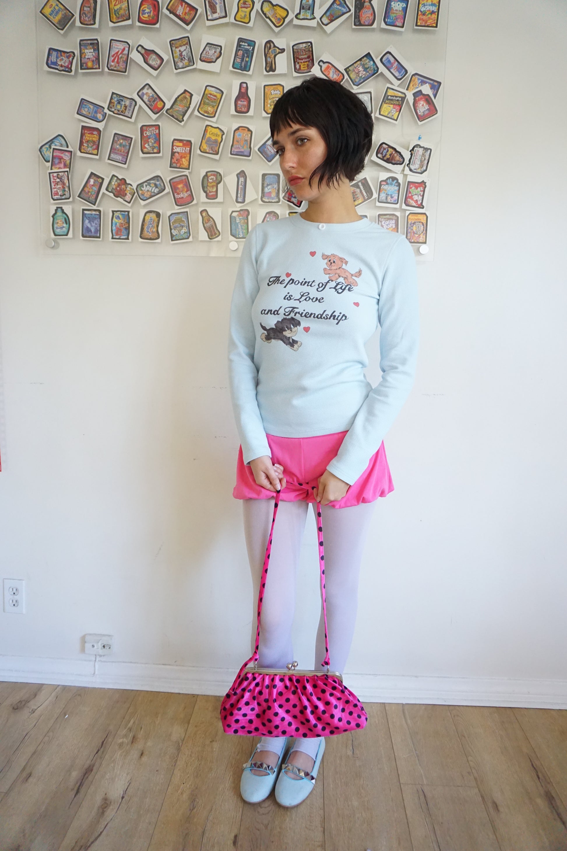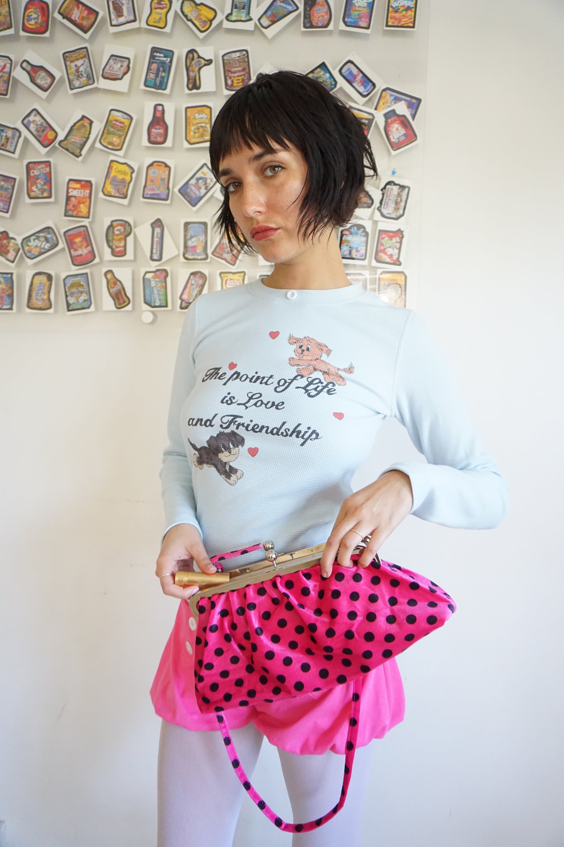 The Lala Purse is tiny, flirty, and a little bit dramatic — just how we like it. Made from soft hot-pink velour covered in black polka dots, she’s serving vintage fantasy with a Blondita twist.