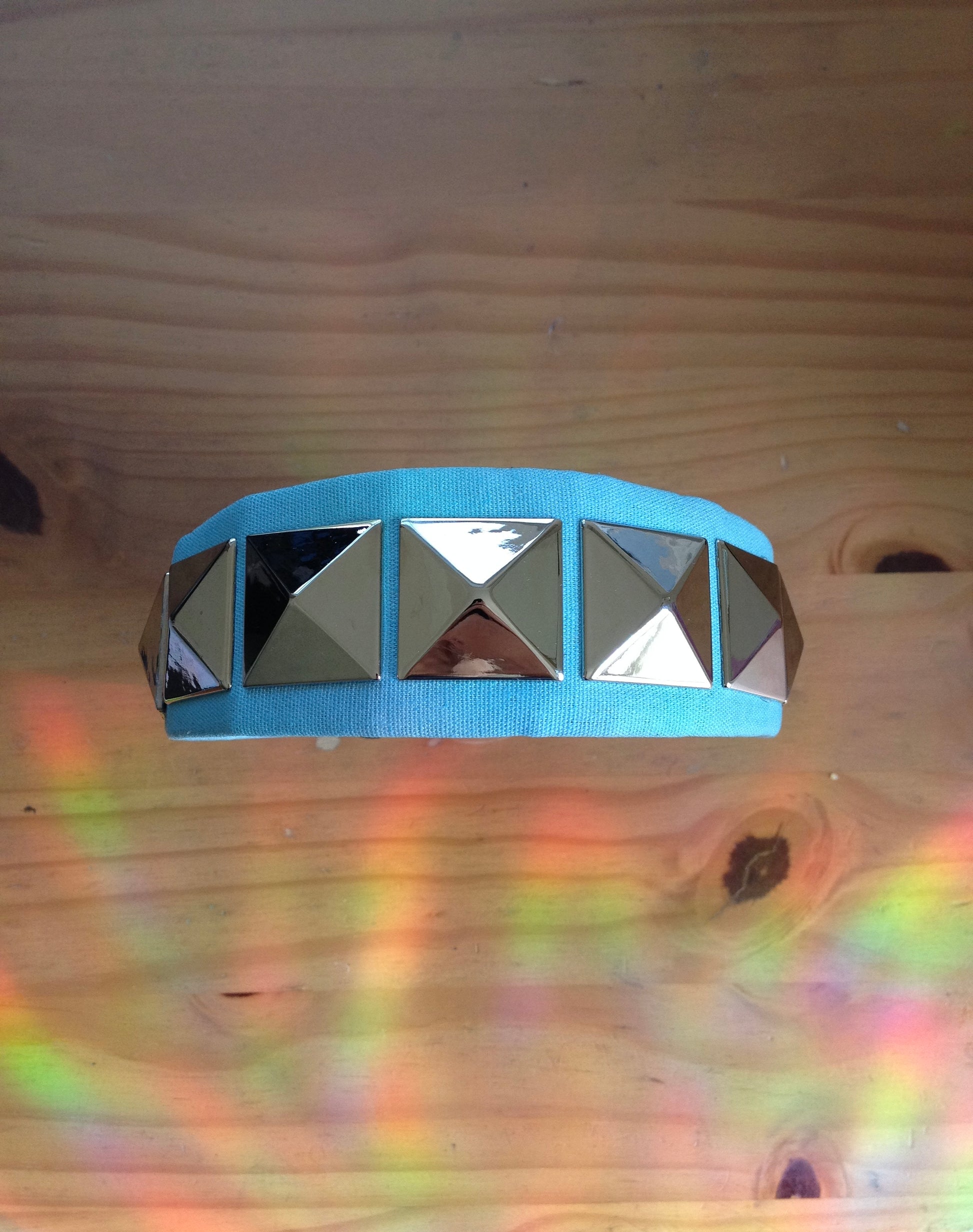 A structured aqua base wrapped in smooth fabric, finished with oversized metallic pyramid studs that catch the light from every angle. She’s bold, glossy, and a little dramatic — the easiest way to turn a simple outfit into a full look.