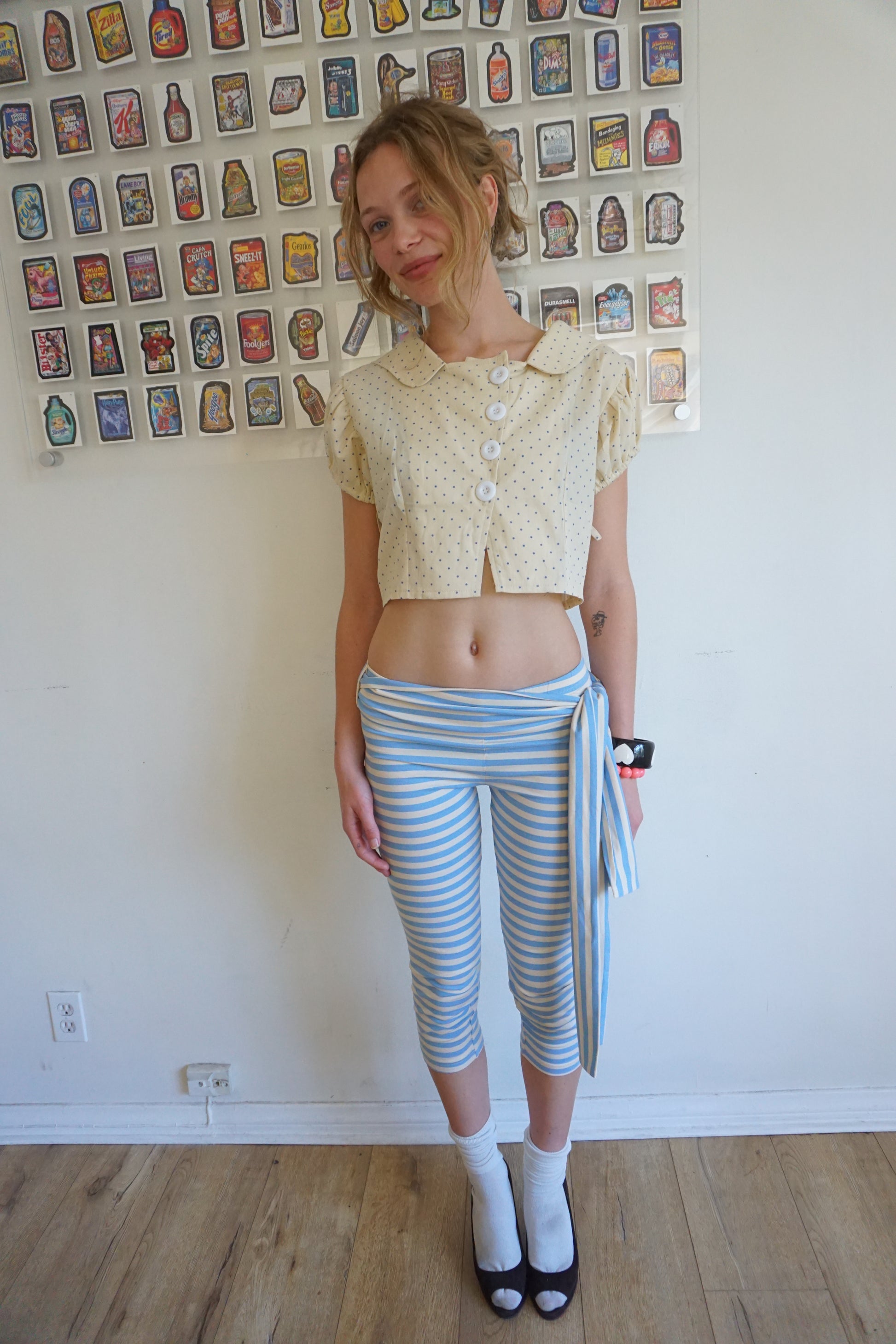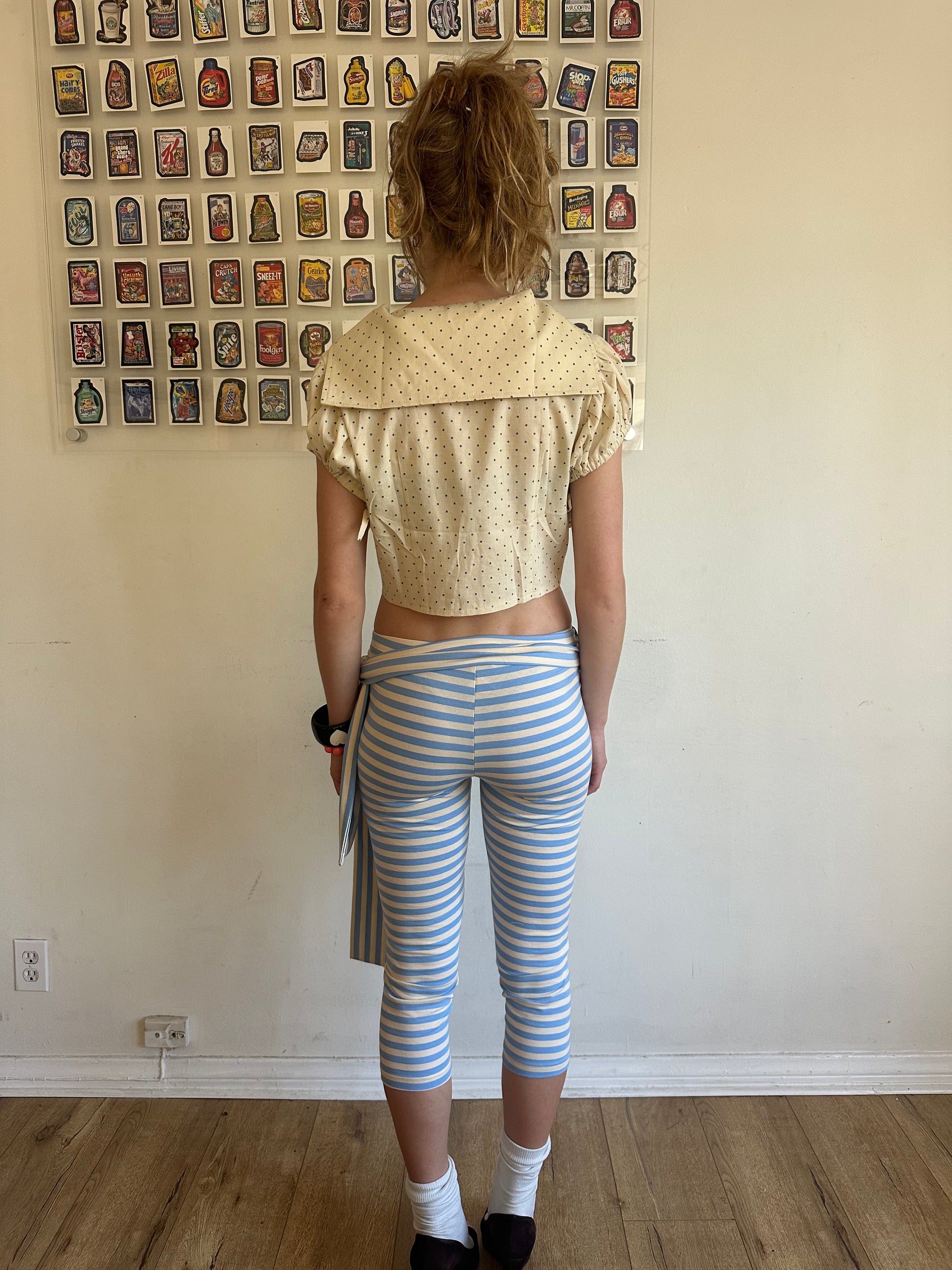 The Polly Capri Pants are a sweetly fitted, mid-calf silhouette in classic blue + cream stripes, finished with a detachable wrap-tie belt for that extra vintage charm.