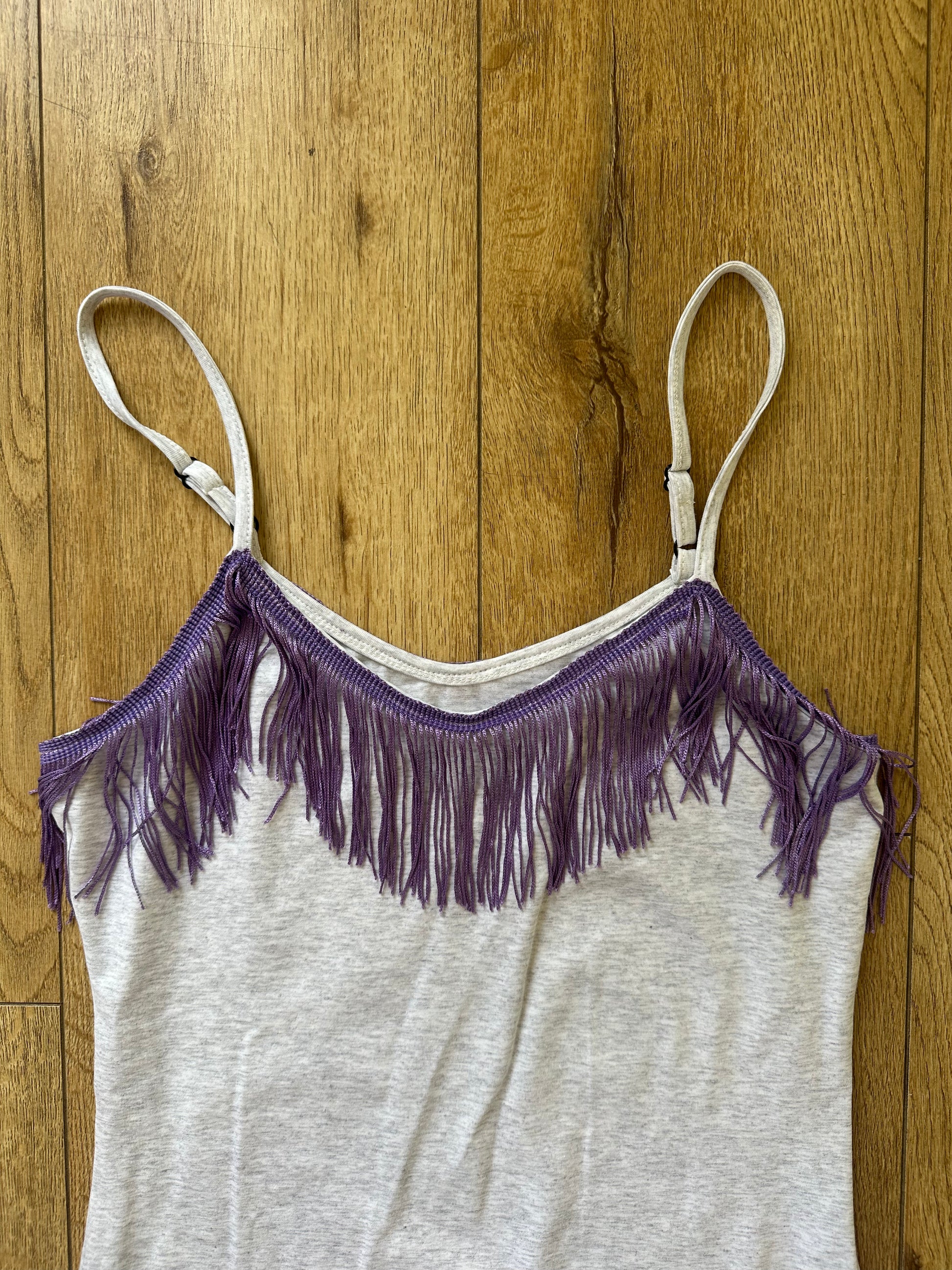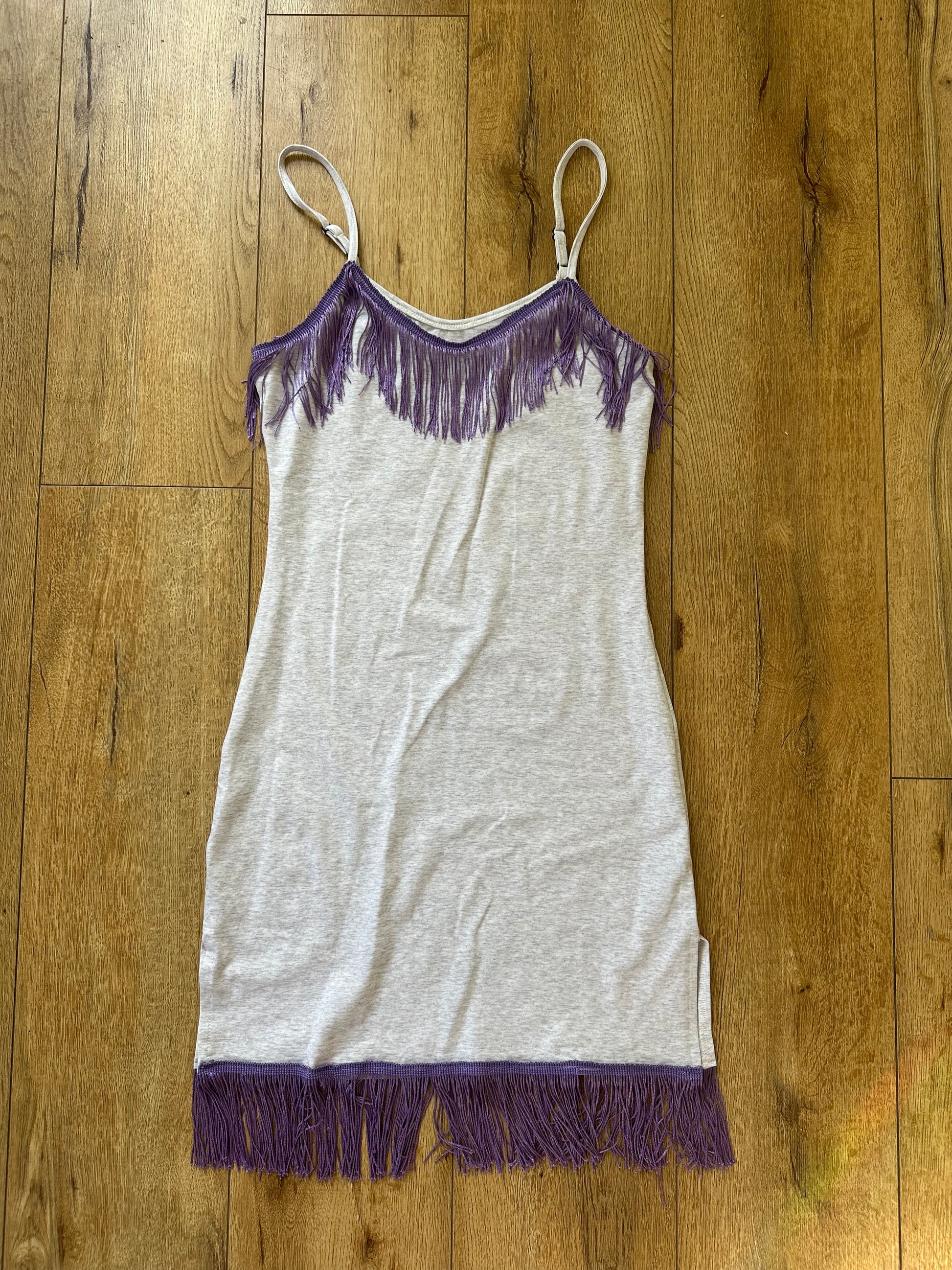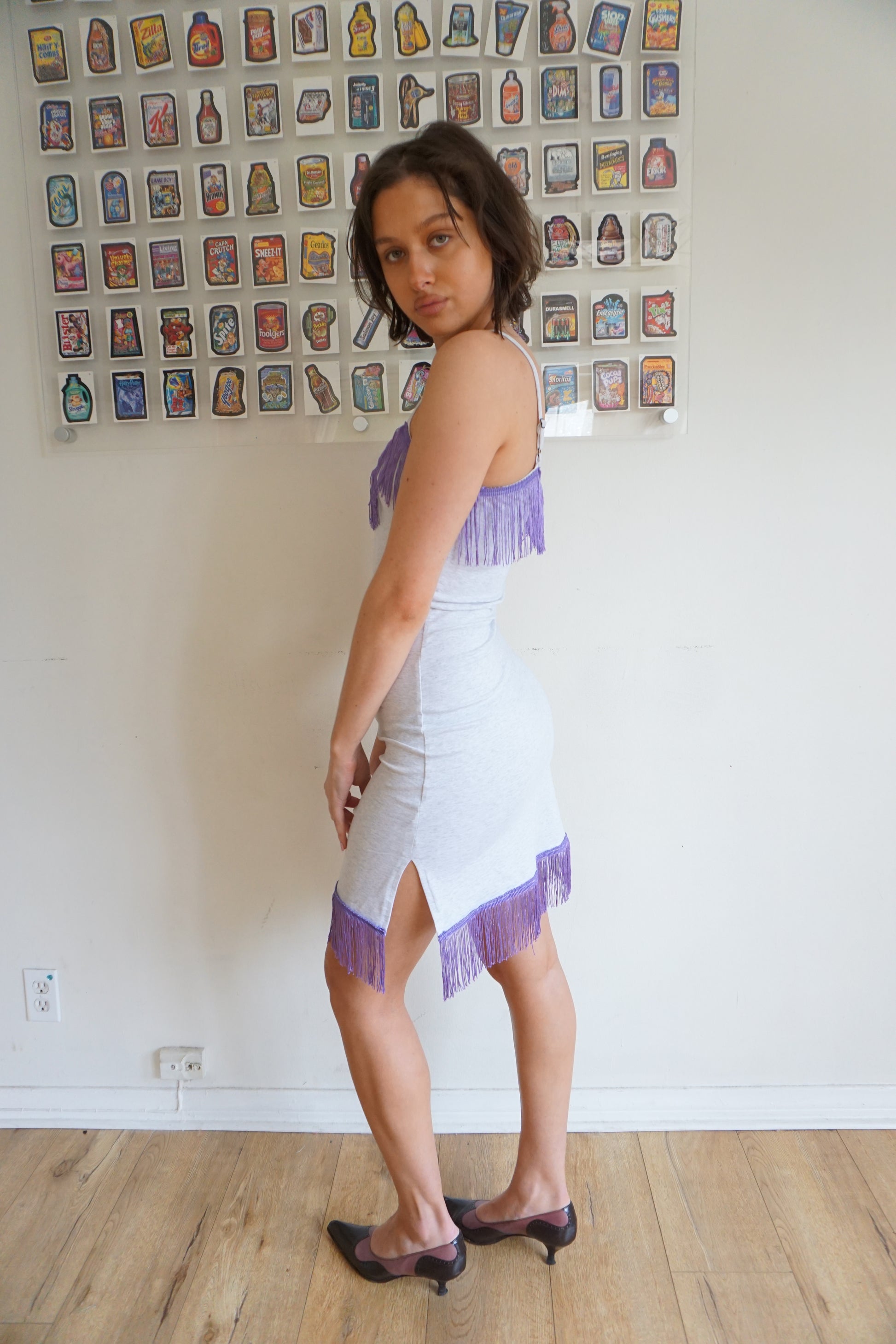A fitted slip dress trimmed with delicate purple fringe at the neckline and hem for the prettiest little movement moment. With adjustable spaghetti straps and a soft, stretchy, body-hugging fit, it moves with you effortlessly. Playful, flirty, and just a little bit dramatic.